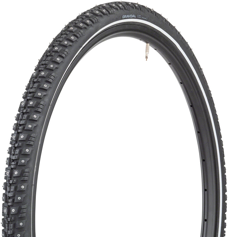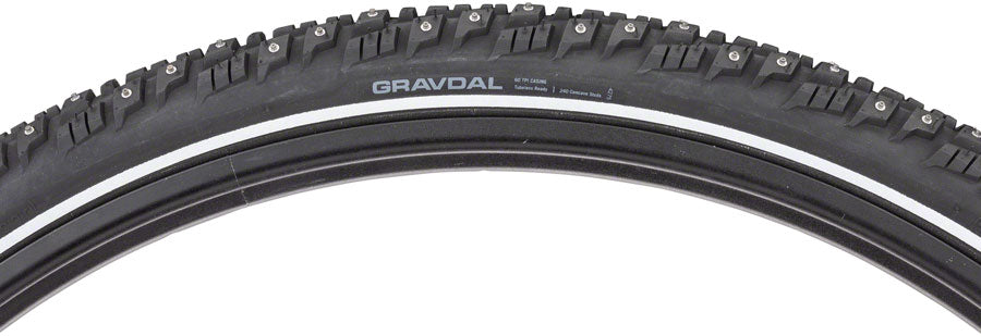 45NRTH Gravdal Tire - 650b x 38 Tubeless Folding Black 60tpi 240 Concave Carbide Studs. Versatile and confidence inspiring the Gravdal securely navigates through harsh winter conditions with concave carbide studs for added traction in icy conditions.Siping creates a more conforming lug for added traction