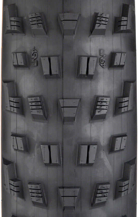 45NRTH Vanhelga Tire - 26 x 4.2 Tubeless Folding Black/Tan 60tpi. Vanhelga is a fat bike tire designed for trail riding in loose snow. It brings traction to a new level with dual-compound rubber triple-siped shoulder knobs and an open tread pattern that sheds snow. Vanhelga sheds snow and tracks flawlessly when the trail becomes soft and sloppy.