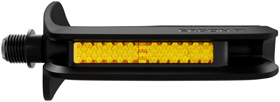 Ergon PT Pedals - Small. The PT pedal is packed with many ergonomic highlights for the demanding Touring rider. The optimized bio mechanics prevents discomfort when pedaling reduces fatigue and provides long-distance comfort even with everyday shoes. The comfort effect extends over the entire leg axis all the way to the back. Thanks to the ergonomic shape inner stop and grippy surface the feet naturally remain in an ideal position on the pedals.Intuitively improved foot alignment thanks to the ergonomic shape with inner stop
