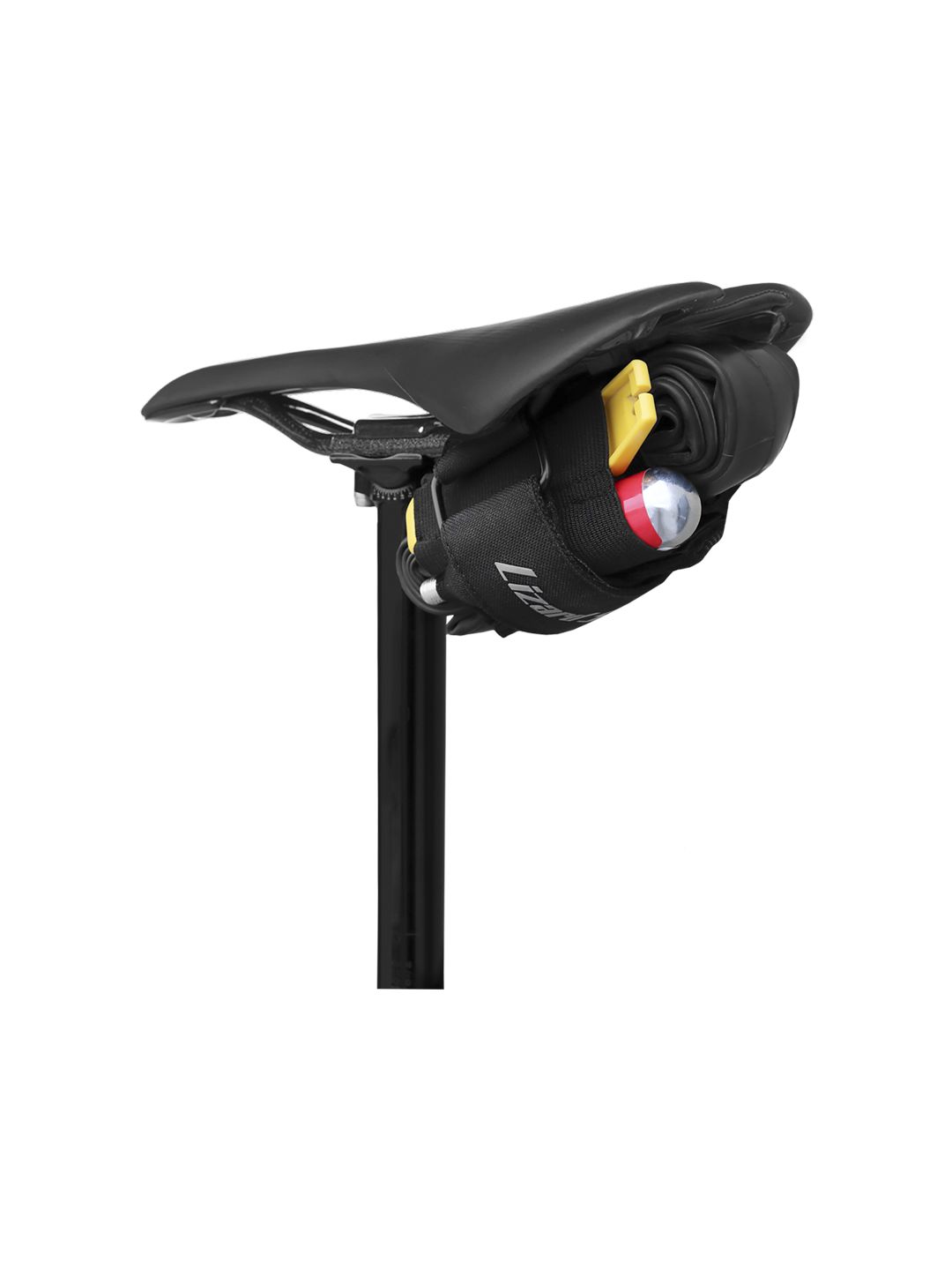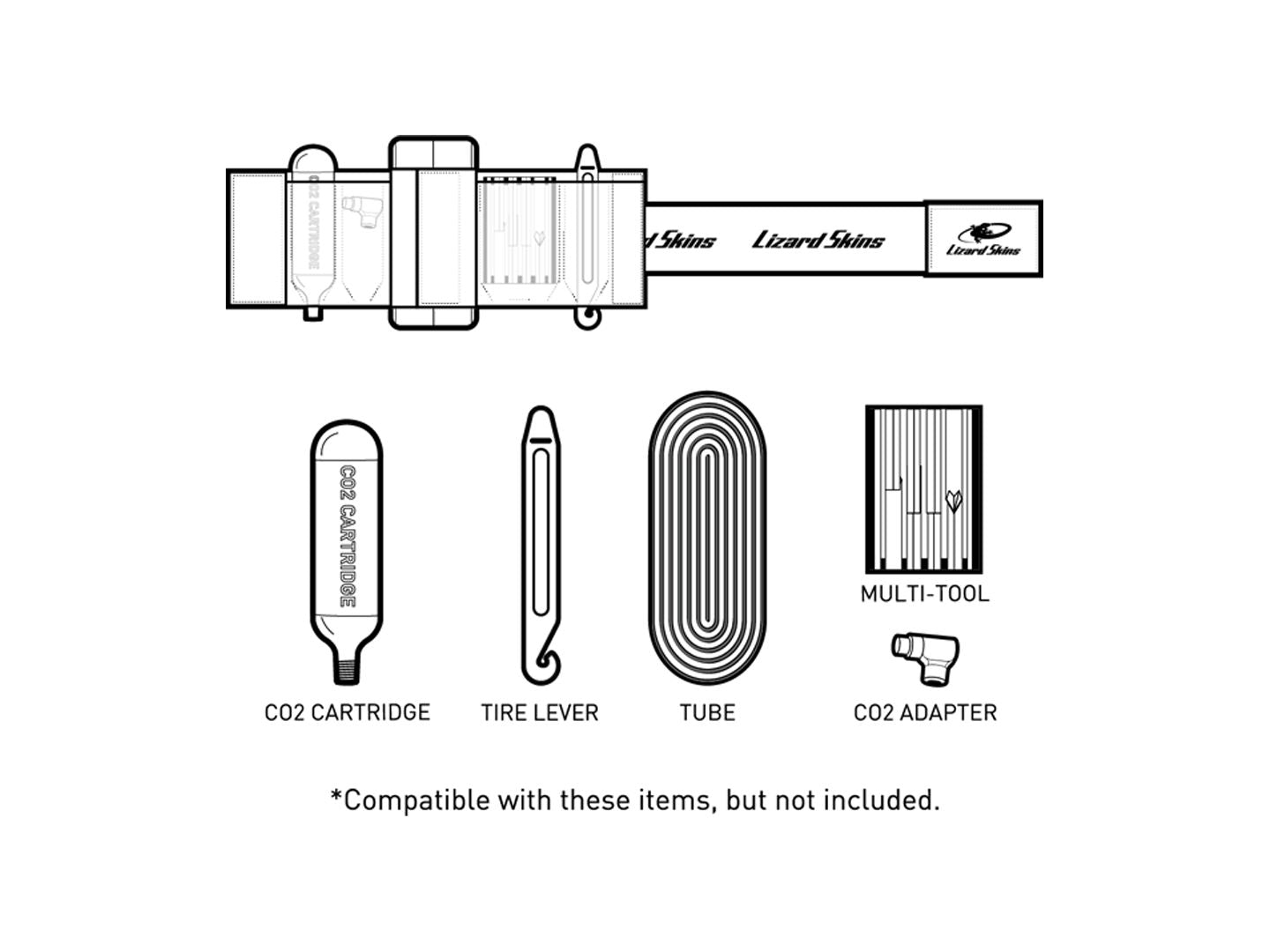 Lizard Skins Utility Strap - Black. The Lizard Skins Utility tube and tool strap is a versatile storage system for tools tubes and CO2. Inner sleeve compresses tube for a compact package. Flexible mounting allows for under seat mounting or elsewhere on the frame.Wide strap and durable metal buckle