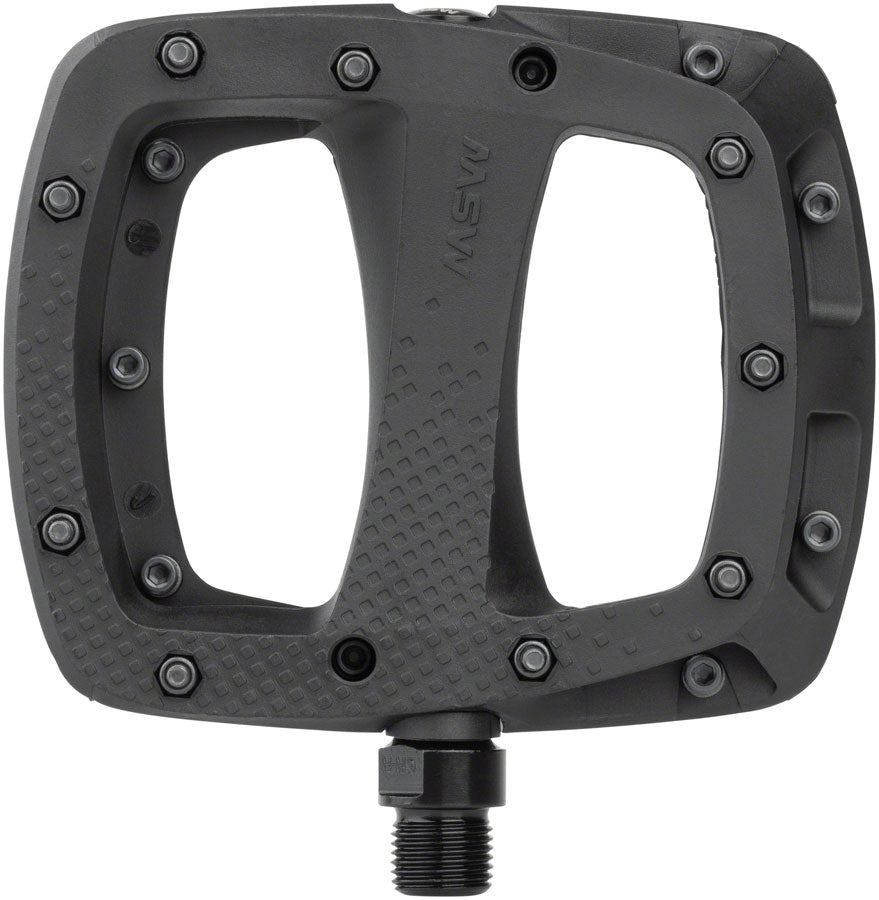 MSW Thump Pedals with Replaceable Pins - Platform Composite 9/16" Black. Built to handle the rigors of riding off-road the MSW Thump composite pedals with replaceable steel pins provide solid traction when the trail gets hairy. The concave shape combined with tall pins provide the perfect balance of comfort and traction for a range of applications meant to expand your horizon.Tough nylon composite body with adjustable replaceable steel pins