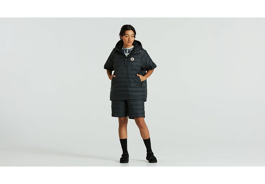 Packable, lightweight insulated unisex anorak. Lightly padded with synthetic insulation and an outer layer in pliant, recycled polyamide. Optimized for long bike rides as a reinforcement layer for men and women. Adjustable cinch hood and cinch for adjusting the hem to stop air from flowing up. Packs into kangaroo pocket. Unisex fit. Part of the Specialized/Fjällräven series for urban rides and bikepacking adventures.