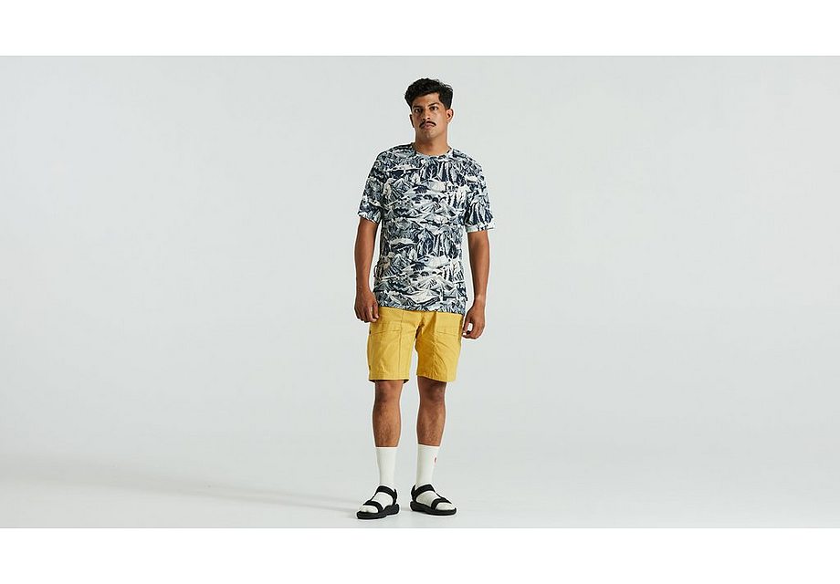 A light t-shirt in Merino wool and recycled polyester. Combines the temperature-regulating properties of wool with the durability and moisture-wicking properties of polyester. Features a Hi-Low hem thats slightly longer in the back and a zippered back pocket on the right-hand side for your keys, cash, or credit card. Slightly longer sleeves provide extra protection from the sun. Regular fit. Part of the Specialized/Fjällräven Exchange series for urban rides and bikepacking adventures.