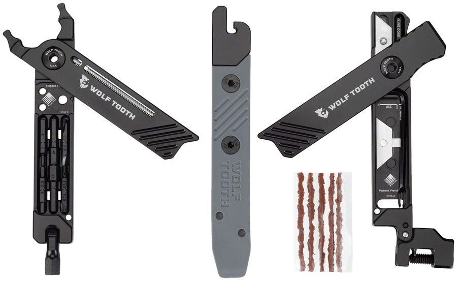 Wolf Tooth 8-Bit Kit One. The new 8-Bit System is a group of multi-tools designed to work together to solve most trailside fixes. They are lightweight strong versatile and small enough to fit in a jersey pocket or riding tool wrap. Three multi-tools begin the 8-Bit System: 8-Bit Chainbreaker + Utility Knife Multi-Tool 8-Bit Tire Lever + Rim Dent Remover Multi-Tool and 8-Bit Pack Pliers. A total of 22 functions between the three tools will keep you rolling to the next town or trailhead.
